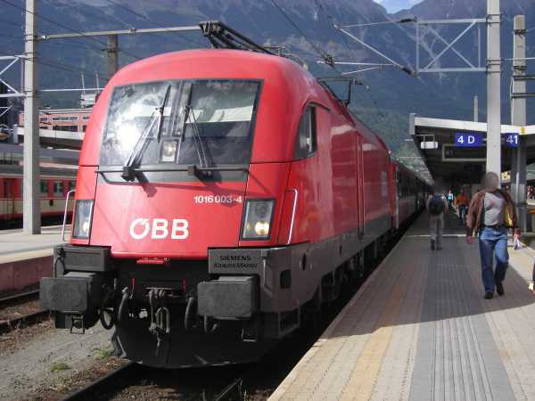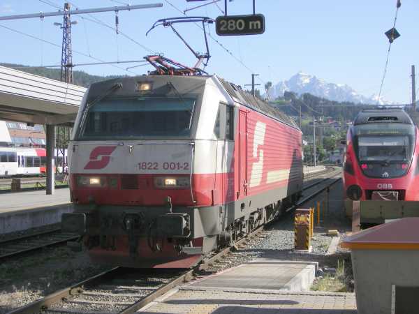 1822 001 Innsbruck Hbf 19.05.2007 Nun haben wir noch die so genannte Brenner-Lok. Ursprünglich wollte man mit dieser Baureihe die Transitprobleme über den Brenner in den Griff bekommen, jetzt ist sie hauptsächlich im Korridor-Einsatz nach Osttirol. |