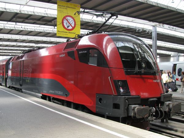 1116 203 Spirit of Linz München Hbf 25.07.2009 Nach dem mir vor gut 2 Jahren in Kufstein bereits eine erste railjet-Farbvariante (1016 034 in hell-/dunkelgrau) vor die Linse kam, ist es diesmal endlich die reguläre Version, die hier in München auf ihre Abfahrt als RJ67 nach Budapest wartet. |