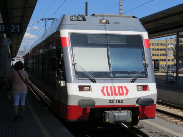 22 162 Linz Hbf 22.07.2015 Die Linzer Lokalbahn setzt aus zwei Lieferungen der Jahre 2000 und 2005 insgesamt 14 Triebzüge der Baureihe GTW 2/6 von Stadler ein. Die Nummer 162 stammt aus der zweiten Lieferung. |