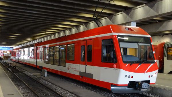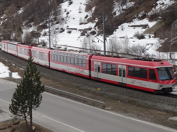 MGB 2025 Zermatt 04.04.2016 In den Jahren 2007/08 und 2014 wurden 8 dieser dreiteiligen Triebzüge bei Stadler Bussnang beschafft. Sie können auf dem gesamten Streckennetz der MGB eingesetzt werden. |