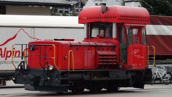 MGB 72 Zermatt 03.04.2016 Diese etwas seltsam aussehende Lokomotive ist eine dreiachsige dieselelektrische Rangierlokomotive, die ihren Dienst im Bahnhof Zermatt versieht. |