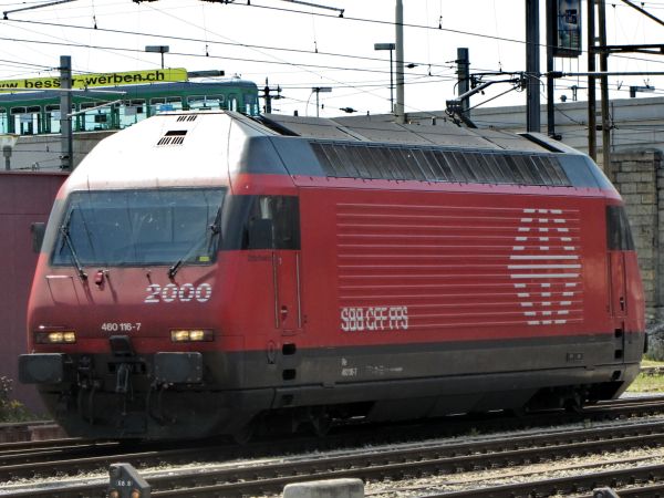 Re 460 116 Basel SBB 02.06.2012 Sie wurden zwischen 1991 und 1997 beschafft. Bis auf derzeit 16 zur SBB Cargo gehörenden Maschinen sind alle anderen Exemplare der Hochleistungslok im Personenverkehr im Einsatz. |