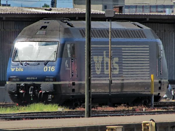 Re 465 016 Basel Bad Bf 02.06.2012 Sie gehört zu den 10 Exemplaren der "Lok 2000", die als Weiterentwicklung der Re 460 ab 1994 im Auftrag des Bundes von der SBB beschafft und an die BLS weitervermietet worden sind. |