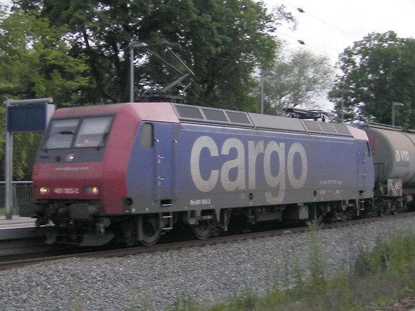 Re 481 003 Jena Paradiesbahnhof 10.05.2007 Diese SBB-Baureihe gehört zur gleichen Lok-Familie wie die DB-Baureihen 145.0 und 146.0. Sie wurden ursprünglich für die MThB als Baureihe Re 486 bestellt, kamen nach deren Insolvenz aber zur SBB Cargo und wurden durch sie ausschließlich in Deutschland eingesetzt. Inzwischen an MRCE verkauft, wurden sie an HGK (Hafen und Güterverkehr Köln) weitervermietet. |