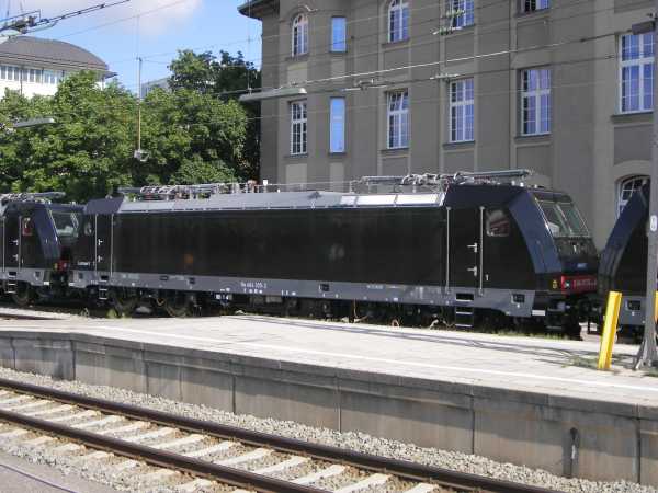 Re 484 195 MRCE München Hbf 16.05.2007 Die Beschriftung dieser Lok lautet am Kasten Re 484 195 und an der Pufferbohle E 484 195. Es sind für die Schweiz gebaute Loks, die für den Italien-Verkehr ausgerüstet sind, die dortigen Behörden fordern die an der Pufferbohle erkennbare Beschriftung. |