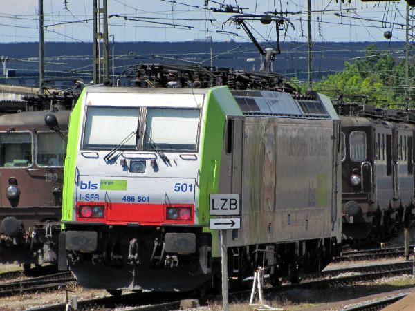 Re 486 501 BLS Basel Bad Bf 02.06.2012 Diese zur Familie der TRAXX F140 MS gehörende Lok ist eine von 10 bei der BLS im Einsatz befindlichen Loks der Version DACHI. |