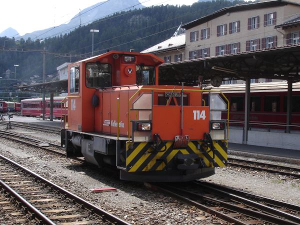 RhB 114 St. Moritz 11.08.2009 Im Jahr 2002 wurden die Tm 2/2 mit den Nummern 111 bis 114 beschafft. Sie sind ein Nachbau der Serie Tmf 2/2, allerdings ohne Funkfernsteuerung. Laut Wikipedia sind ihre Arbeitsgebiete vor allem Thusis, Ilanz und Davos, aber man sieht sie auch am frühen Nachmittag in St. Moritz. |