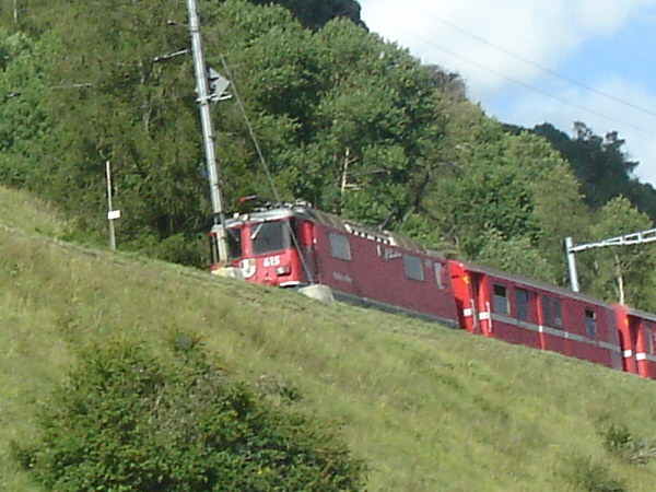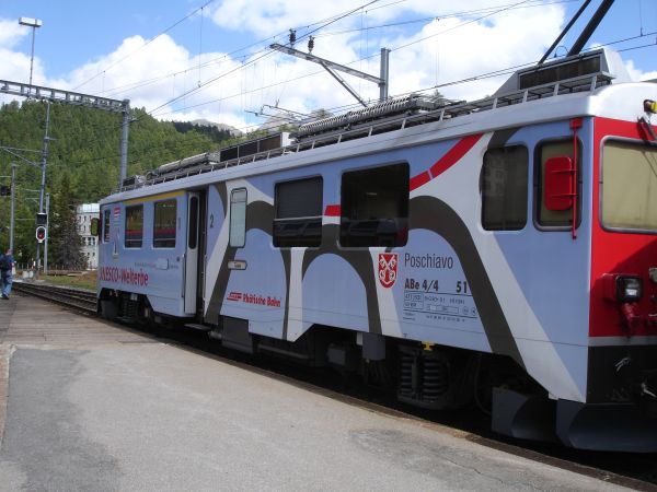 POSCHIAVO St. Moritz 11.08.2009 Dieser Triebwagen gehört zu einer Serie, die zwischen 1988 und 1990 für die Berninabahn beschafft worden ist. Die RhB entschied sich als erste Bahngesellschaft für die Drehstrom-Antriebstechnik mit öltauchgekühlten GTO-Umrichtern. |