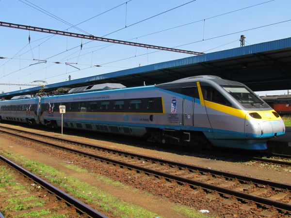 003 CD Cheb 02.07.2015 Von dieser hochwertigsten Zuggattung der CD existieren 7 siebenteilige Einheiten, die den Markennamen SuperCity Pendolino führen. Nach kurzem Halt fuhr der noch mit Werbung der Eishockey-WM 2015, die in Tschechien stattfand, beklebte Zug weiter nach Frantiskovy Lazne. |