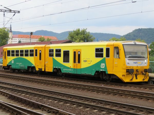 814 017 + 914 017 CD Decin hl.n. 25.06.2015 In den Jahren 2005 bis 2012 entstanden 209 zweiteilige Triebwagen dieser Baureihe aus der Rekonstruktion der Baureihe 810. Der mit 814 bezeichnete Teil ist angetrieben, der mit 914 bezeichnete dagegen nicht. |