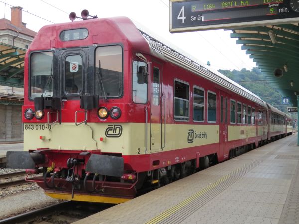 843 010 CD Decin hl.n. 25.06.2015 Hier sehen wir in der ursprünglichen Farbgebung einen der 31 zwischen 1995 und 1997 gebauten Triebwagen, der mit zwei farblich passenden Personenwagen unterwegs ist. |