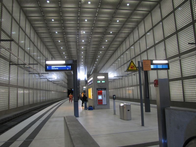 Trotz des an den Enden des Bahnsteigs einfallenden natürlichen Tageslichts macht der Bahnhof auf Grund seiner geringen Höhe einen relativ dunklen Eindruck, was mir auch unmissverständlich von meiner Kamera mitgeteilt wurde. Es war dennoch möglich, auch ohne Einsatz des Blitzes, ein paar wackelfreie Bilder zu erzeugen. |