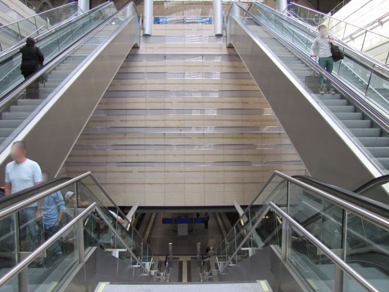 Wieder sehen wir eine hohe und helle Halle. Da es ein wenig Zeit bis zur Weiterfahrt gab (die berühmte 5-Minuten-Lücke kurz vor der vollen Stunde) bin ich verrückter Kerl doch einfach mal mit Rolltreppe hoch und wieder runter gefahren, um dabei einige Aufnahmen der Halle zu machen. |