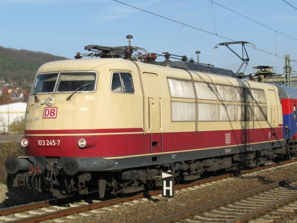 103 245 langer Führerstand Jena Saalbahnhof 15.11.2008 Nachdem der Erstkontakt mit dieser Lok in Salzburg stattfand, musste ich etwa ein Jahr später nicht ganz so weit reisen, als sie mit buntem Wagenpark in Richtung Süden unterwegs war. Ab Maschine 103 216 wurden die Führerstände, auch für eine Klimaanlage, um 70 cm verlängert. |