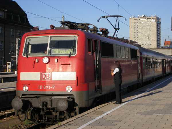 111 071 München Hbf 18.05.2007 Diese Lok bringt gleich meinen Zug zurück nach Murnau. In diesen Tagen habe ich sie auch in Mittenwald und Garmisch-Partenkirchen aufgenommen. |