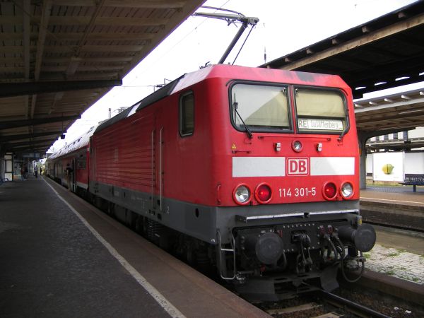 114 301 ex 143 120 Dessau Hbf 25.08.2007 Obwohl die Umrüstung (Oktober 2006) auf die 140 km/h - Version wohl mit weniger als 50.000 Euro zu Buche geschlagen habe, blieb auch sie ein Einzelgänger. Übrigens, am 05.06.2010 habe ich sie in Wittenberg wieder als 143 120 vor die Kamera bekommen. |