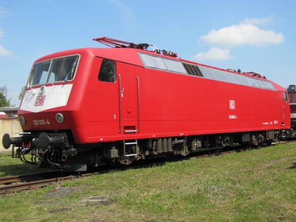 120 005 ex 752 005 Bw Weimar 19.05.2012 Die Vorserienloks wurden 1979 bis Anfang 1980 ausgeliefert. Während der knapp 4-jährigen Erprobung liefen die Maschinen zusammen rund 4 Mio. km. Zusammen mit der 120 004 war diese Lok an den Basisarbeiten für die Baureihe 101 beteiligt. |