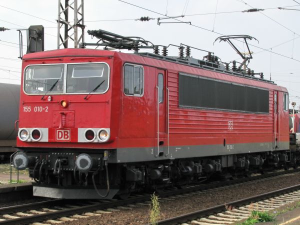 155 010 Serienlok Großkorbetha 12.09.2008 Der Kenner bemerkt die Unterschiede zur Vorserie vor allem bei der Größe der Fenster und der Lage des dritten Spitzenlichtes. Die Serienloks wurden ab 1977 ausgeliefert. Der erste Stationierungsort der 010 war Dresden. |
