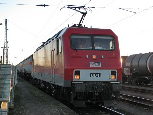 MEG 804 ex 156 004 ex 252 004 Großkorbetha 17.01.2011 Im Jahr 1991 als letzte von 4 Maschinen der Baureihe 252 in Betrieb genommen wurde sie mit ihren 3 Schwestern im September 2003 an die DB-Tochter MEG verkauft. Zum ersten Mal bin ich ihr so nah gekommen. Drei der vier Maschinen habe ich bisher erst "erwischt". |