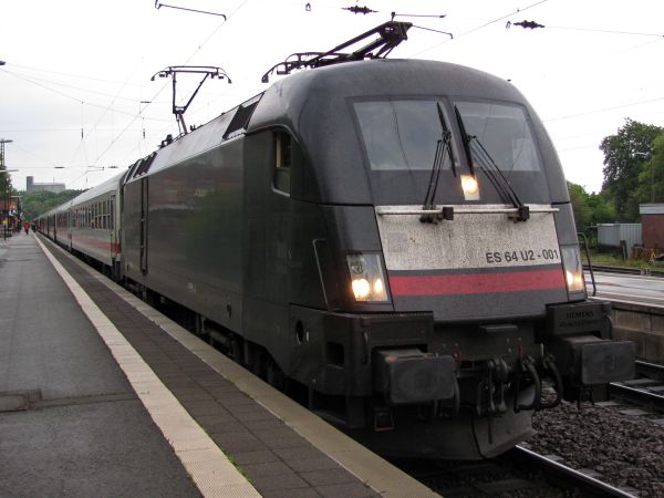 ES64U2-01 mrce 182 501 Uelzen 17.05.2011 Weiter unten gibt es diese Maschine noch einmal in Dispo-Lackierung, aber dies ist ihr "Kleid" im Frühjahr 2011 im Einsatz von IC-Zügen. Die Baureihe 117 galt als buchmäßige und war nie an den Fahrzeugen angeschrieben. |
