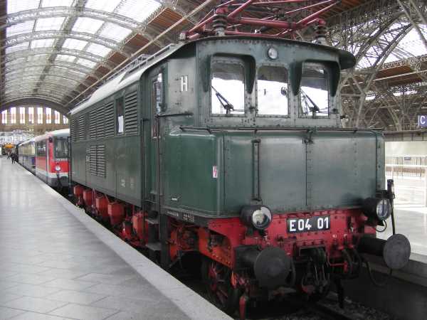 E 04 01 Leipzig Hbf 04.09.2007 E 04 01 wurde 1932 gebaut und versah ihren Dienst bis 1976 in Leipzig. Danach wurde sie DR-Museumslok. |