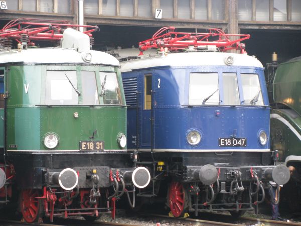 E 18 31 + E 18 047 DB-Museum Halle / Saale 05.07.2008 1937 in Leipzig (E18 31) und 1939 in Nürnberg (E18 047) in Dienst gestellt finden sich hier beide Loks anlässlich des 5. Geburtstages des DB-Museums Halle/Saale einträchtig im Lokschuppen Halle P wieder. |