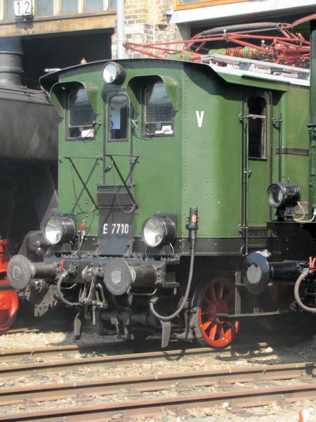 E 77 10 DB-Museum Halle / Saale 03.07.2010 Diese Maschine wurde 1924 von Krauss & Comp. in München hergestellt und kam als 22010 zur Bayerischen Staatsbahn. 1926 wurde sie zur E77 10, kam 1946 in die UdSSR und kehrte schließlich 1952 zur DR zurück. Die Ausmusterung erfolgte am 10.08.1967 in Leipzig-Wahren. Im Jahr 1971 wurde sie DR-Museumslok im Verkehrsmuseum Dresden. |