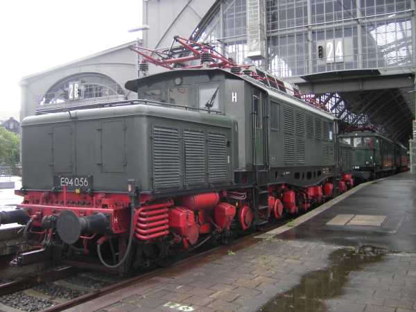 E 94 056 Leipzig Hbf 11.09.2007 Diese 1941 von der AEG gebaute und heute noch betriebsfähige Museumslok zog übrigens nach der Wiederelektrifizierung der Saalebahn Anfang der 90er Jahre am Vortag der Neueröffnung den Sonderzug mit den Erbauern. |