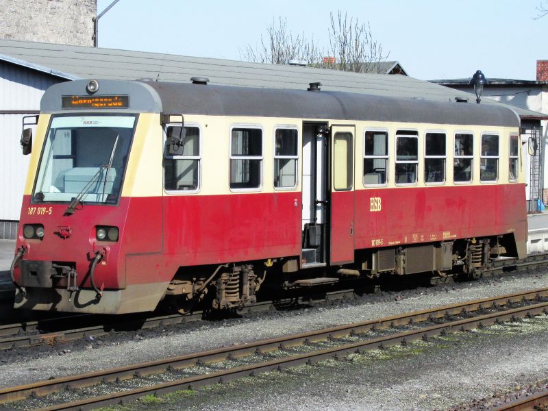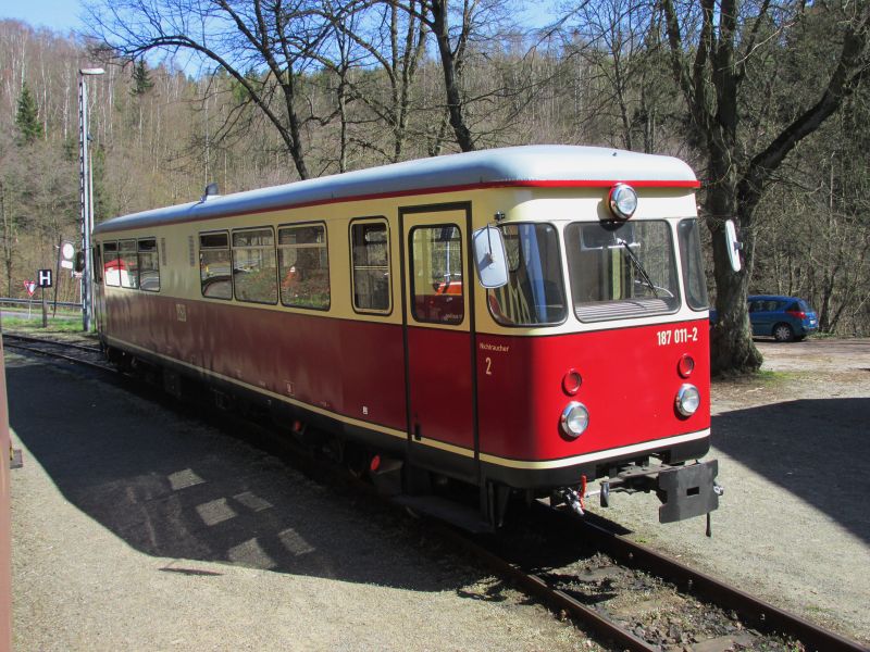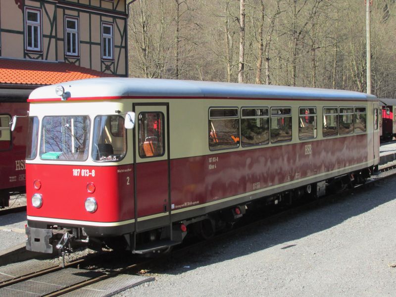 187 013 ex KAE VT2 ex T4 (Inselbahn Juist) ex T4 (Inselbahn Langeoog) 18.03.2015 Eisfelder Talmühle Dieser Triebwagen wurde ursprünglich ab 1955 auf der Schmalspurstrecke Lüdenscheid - Altena eingesetzt. Im Herbst 2012 wurde er zu einer umfassenden Aufarbeitung nach Hennigsdorf gebracht. Anfang diesen Jahres kehrte der Triebwagen mit neuem Motor und hydrodynamischem Getriebe nach Wernigerode zurück. |
