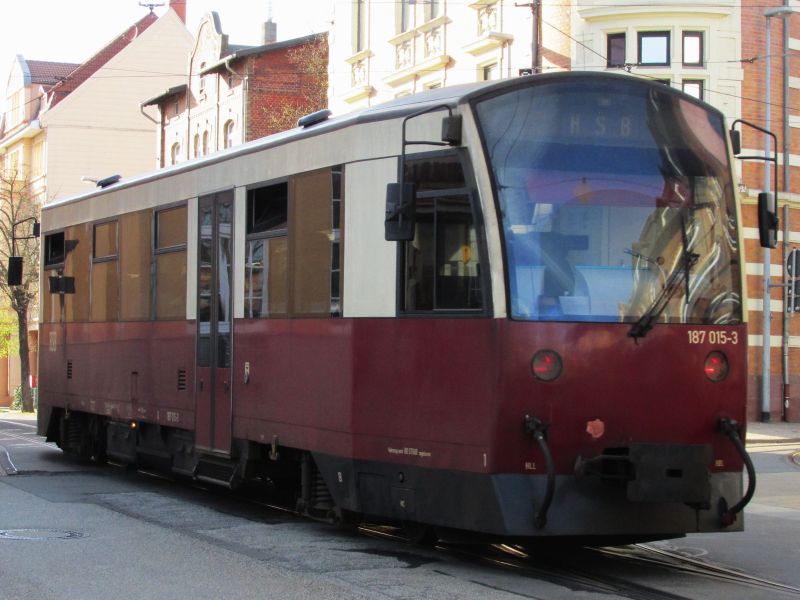187 012 ex MEG T15 ex WEG T35 ex T3 13.09.2007 Quedlinburg Dieser Triebwagen wurden ebenfalls 1955, aber von Fuchs gebaut. Seine Hauptaufgabe ist wohl die Anbindung von Quedlinburg an das Netz der HSB. |