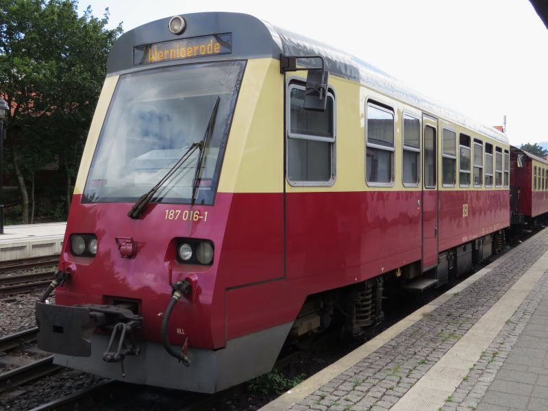187 016 08.08.2016 Wernigerode Nach dem sich mir an diesem Tag schon 3 Dampflokomotiven der HSB als Erstkontakt präsentiert hatten, wollte ich meinen Augen nicht trauen, als ich auch noch diesen Triebwagen vor die Kamera bekam. |