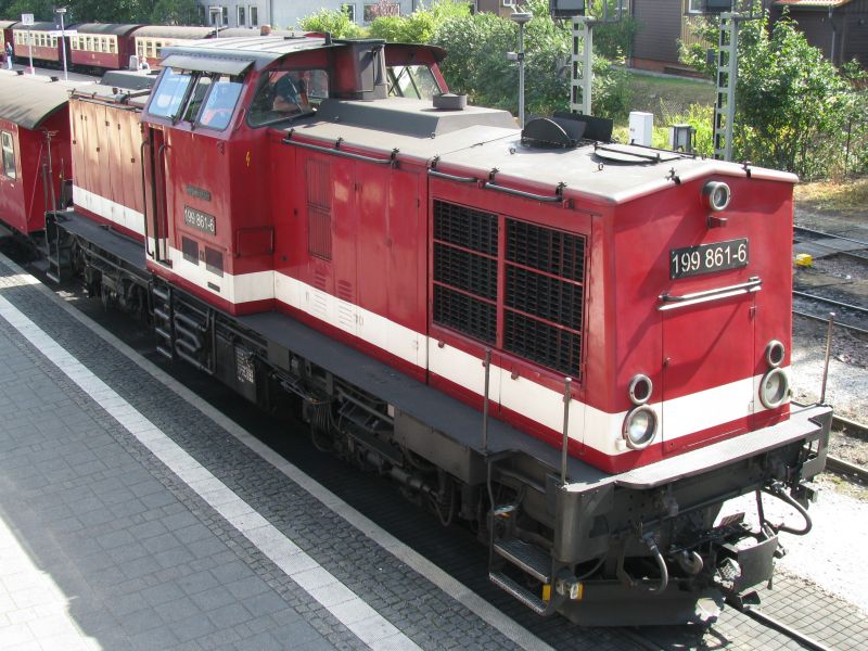 199 861 ex 114 861 ex 299 110 23.08.2009 Wernigerode Sie war 1976 normalspurig nach Aue ausgeliefert worden und stellt hier die Waggons für den nächsten Zug bereit. |