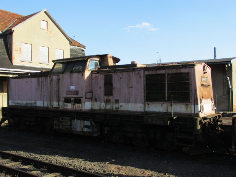 199 877 ex 110 877 ex 299 116 15.04.2015 Nordhausen Nord Die am 09.03.1978 normalspurig in Dienst gestellte Lok erhielt zum 13.12.1990 ihren Umbau für die 1000 mm Spurweite. Ihr Aussehen deutet an, dass ihre Abstellung schon recht lange anhält. Daran kann auch die sanfte Abendsonne nichts ändern. Abgestellt wegen Fristablauf. |