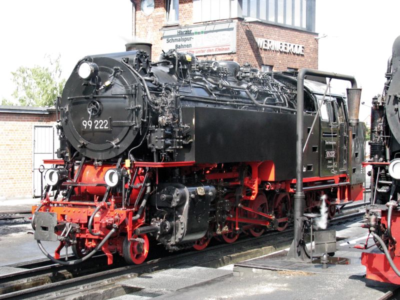 99 222 23.08.2009 Wernigerode Sie ist eine von drei Maschinen, die ursprünglich für die Thüringer Schmalspurbahnen Eisfeld - Schönbrunn gebaut worden war. Nach deren Stilllegung 1966 gelangte sie zur Harzer Schmalspurbahn. |