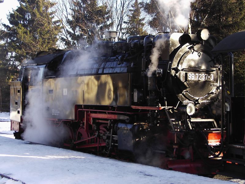 99 7237 ex 99 237 II 14.01.2006 Drei Annen Hohne Bei dieser Aufnahme kam es mir sehr entgegen, dass der Schnee im Bahnhof Drei Annen Hohne fast nur in Resten vorhanden war. Das hat sich wenig später auf dem Brocken dann doch drastisch geändert (siehe 99 7238 und Bahnhof Brocken). Die Lok gehört zu den nach 2004 rekonstruierten Maschinen. |