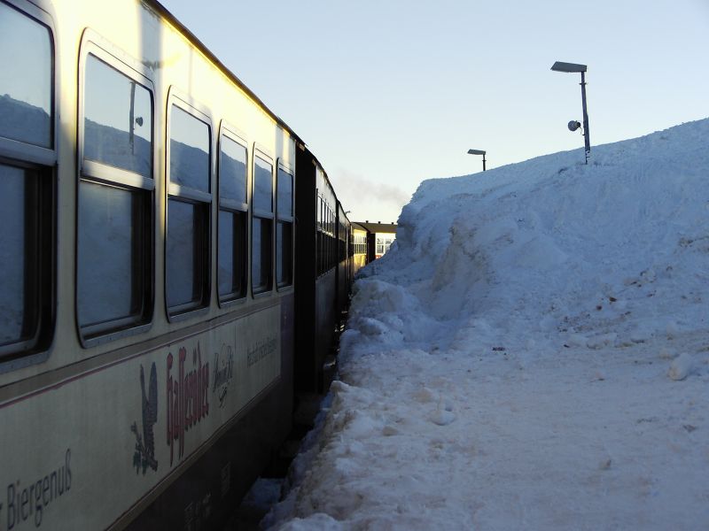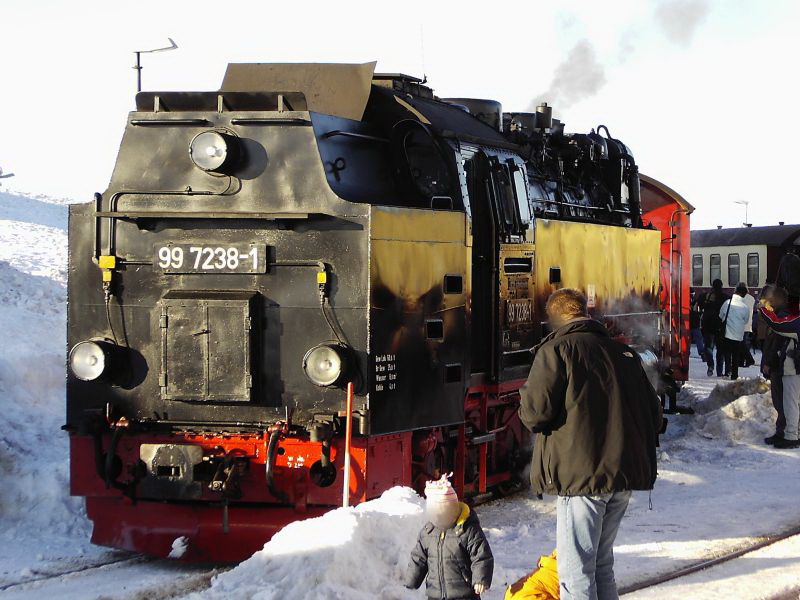 99 7238 ex 99 238 II 14.01.2006 Brocken Von dieser Maschine bis zur 99 7247 stammen alle aus dem Jahr 1956. Hier verdeckt die 99 7238 noch die Tatsache, dass Bahnsteig 1 auf Grund der Schneemenge für lange Zeit nicht betreten werden konnte.