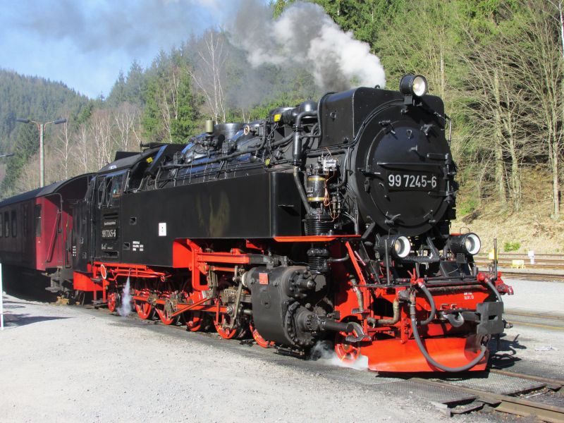 99 7245 ex 99 245 II 15.04.2015 Eisfelder Talmühle Nach dem an dieser Stelle länger eine "Notaufnahme" aus Wernigerode den Platzhalter spielte, kann ich nunmehr eine sehr schöne sonnige Aufnahme dieser Lokomotive zeigen. Mit ihr fand die letzte Etappe einer nahezu sommerlichen Fahrt auf der Selketalbahn statt, die von Eisfelder Talmühle nach Nordhausen führte. Die Lok gehört zu den nach 2004 rekonstruierten Maschinen.