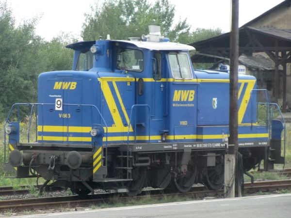 MWB V663 ex 360 572 ex 260 572 ex V60 572 Heidenau 03.09.2008 Von Krupp wurde diese Lok im Jahr 1960 ausgeliefert. Am 09.10.2002 wurde sie von der DB AG in Hagen ausgemustert und jetzt "verdient sie ihre Brötchen" bei der Mittelweserbahn. |