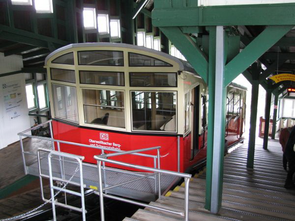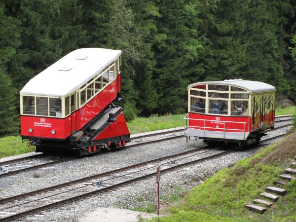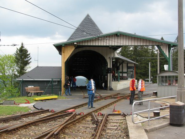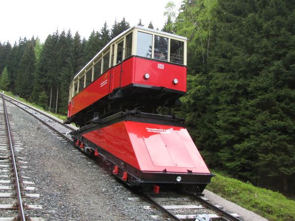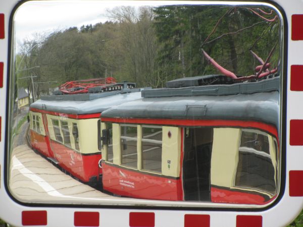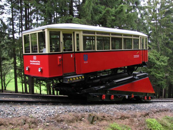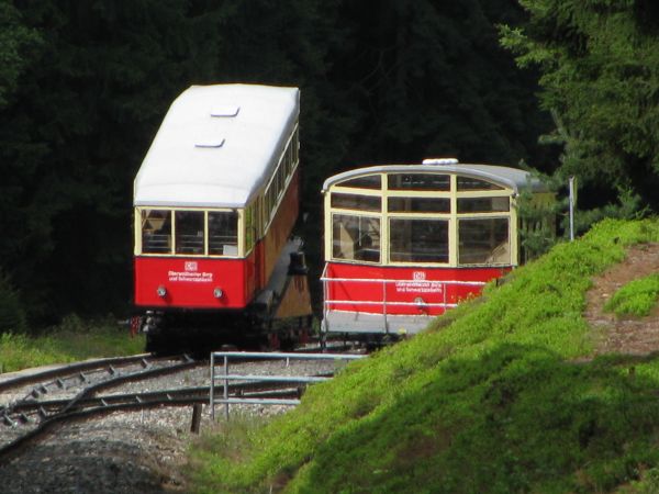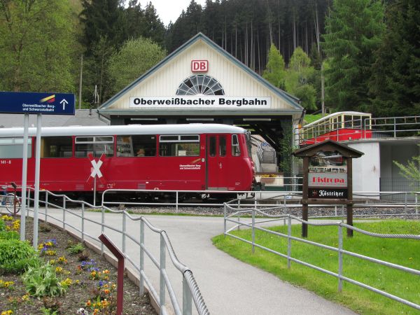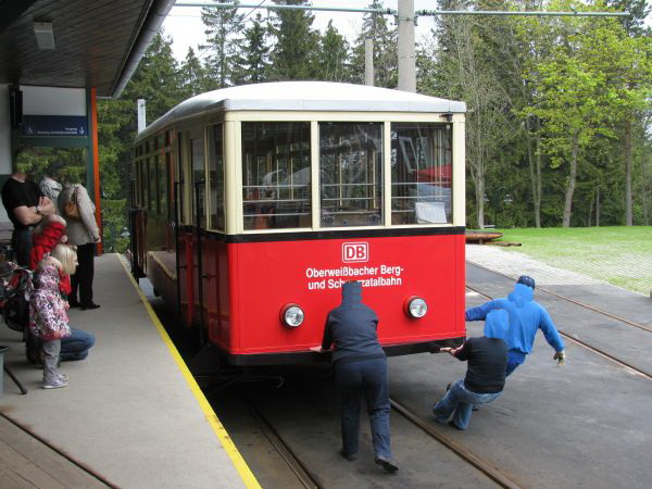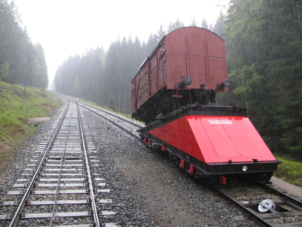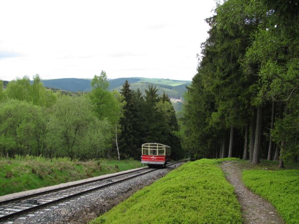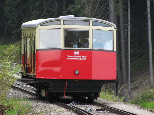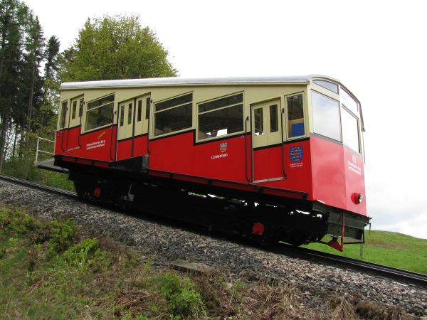 Begegnung, die es nur einmal im Jahr gibt Am 09.05.2010 fand statt, was es nur einmal im Jahr gibt, den spektakulären Transport eines Güterwagens von der Bergstation ins Tal und zurück. Mein Foto entstand bei der Rückfahrt des Güterwagens nach oben und bei deutlich sichtbar schlechtem Wetter. Da die Heckscheibe des Personenwagens sich zum Teil öffnen lässt, sind hier wenigstens keine die Scheibe herunter laufenden Tropfen zu sehen. Gleichwohl musste man aber vorsichtig sein, damit der Fotoapparat nicht einweicht. Da wir chronologisch aber noch immer bei der Bergfahrt sind kommt als nächstes erst einmal die Ankunft in der Bergstation Lichtenhain. |