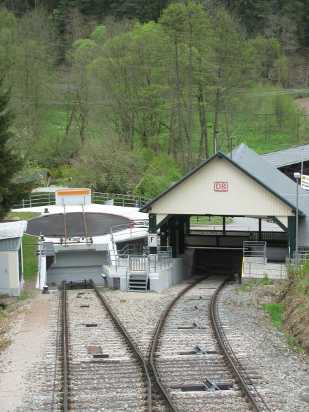 Andock-Stelle an der Drehscheibe Wenn die Rampe wenige Meter von der Endposition entfernt ist sieht man, wohin "die Rampe verschwindet". In diesem Moment hörte man aus nicht sehr großer Entfernung die Pfeife des Triebwagens, ein Blick auf die Armbanduhr ließ vermuten, dass es in einer Minute schlicht unmöglich ist, die verbleibenden 400 Meter zur Talstation zu flitzen und den Zug in Richtung Katzhütte auch noch zu bekommen. Dann konnte man sich auch Zeit lassen und die Fahrt der Güterrampe in Ruhe filmen. |