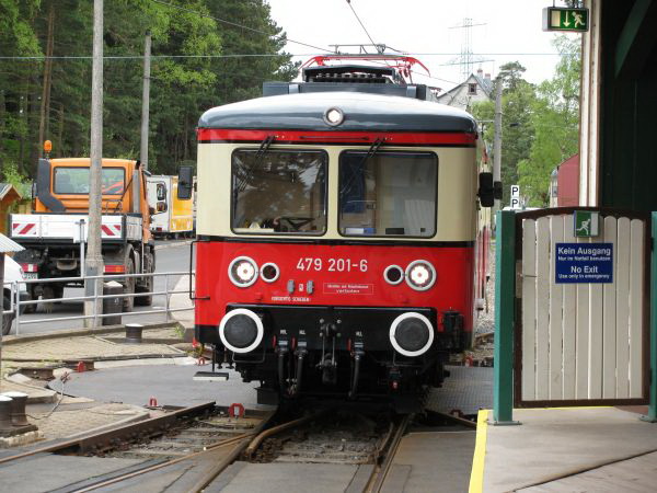 Zwei Möglichkeiten der Ankunft Nach dem ich oben schon mal die leere Talstation gezeigt habe, bietet sich nun die Gelegenheit, einmal den Sinn der unteren Drehscheibe genauer zu erkennen. Hier konnte man einen Güterwagen direkt auf die Scheibe bringen und in Richtung der Streckengleise der Schwarzatalbahn drehen. Die Nutzung der Rampe für den Personenwagen bedingte den Bau eines zweiten Zugangs für die Passagiere. |