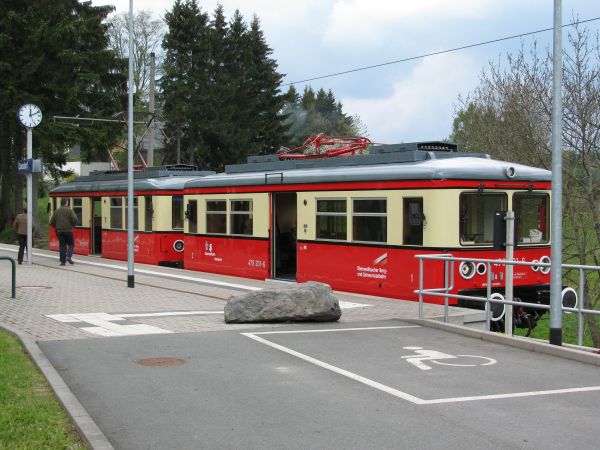(479 201) Etwa 5 Meter vom letzten Fotostandort entfernt öffnet sich dann folgender Blick. Da die Fahrpläne aufeinander abgestimmt sind hat man zwischen der Ankunft mit der Bergbahn und der Abfahrt mit dem elektrischen Triebwagen 11 Minuten Zeit. Auch dies wird zumindest bis Oberweißbach eine "Privatfahrt" werden. |