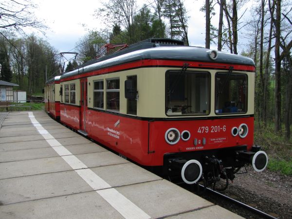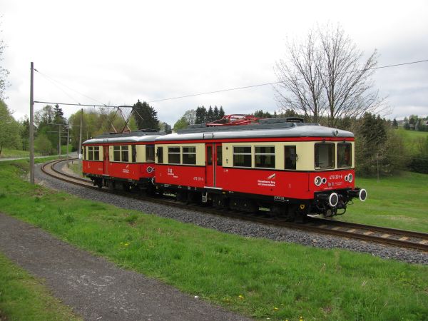 201) Nach einer reichlich 10-minütigen Ruhepause kehrt der Triebzug aus Cursdorf zurück und es folgt eine gemütliche, wenn auch kurze Rückfahrt nach Lichtenhain. Das war an diesem Tag "die Ruhe vor dem Sturm", denn es gab da noch den geplanten Abstieg entlang des Bergbahn-Lehrpfades zur Talstation. Das Wetter war hin und wieder sonnig, wenigstens trocken, wenn auch die Temperatur nur bei knappen 12,5 Grad lag. |