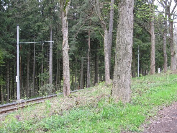 Ein Entfernungsrätsel Die Entfernungsangabe auf dem Schild bezieht sich wirklich auf die im Hintergrund sichtbare Talstation. Aber der Weg biegt an dieser Stelle nahezu im rechten Winkel nach rechts ab, um nach etwa 200 Metern wieder nach links zu knicken. Somit ist das letzte Wegstück nahezu gemütlich flach im Vergleich zu dem, was man eben hinter sich hat. Es gibt sicher sportliche Menschen, die den Weg nach oben zügig schaffen, aber dem Eisenbahnfan oder Wanderer empfehle ich für den Weg nach oben die Bergbahn und den Lehrpfad abwärts nur bei gutem Wetter und mit stabilen Schuhen. |