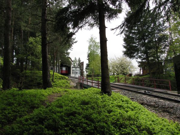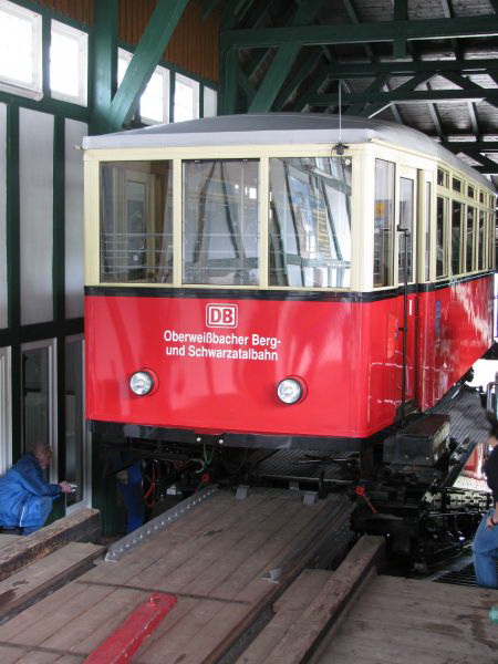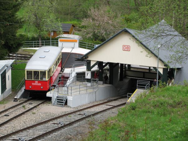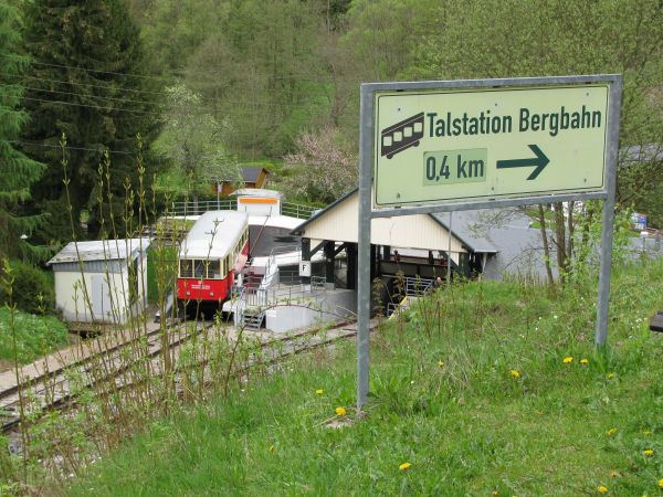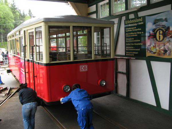 Blick nach hinten zur Talstation Rechts im Bild sieht man das Gleis, auf dem der Personenwagen in der Talstation hält, während links die Güterrampe andocken kann. (Ich komme am Ende der Seite darauf noch einmal zurück.) Für die seltenen Fälle, in denen nicht der Personenwagen auf der Rampe steht, ist es möglich, Güterwagen oder auch Triebwagen der Flachstrecke über die Drehscheibe und ein Anschlussgleis auf die Strecke der Schwarzatalbahn zu bringen. Während der reguläre Güterverkehr bereits in der 1960er Jahren eingestellt worden ist, müssen die Flachstreckentriebwagen regelmäßig zu ihren Fristuntersuchungen nach Saalfeld gebracht werden und das funktioniert nur auf diesem Weg. |
