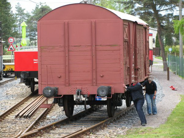 Der Güterwagen wird geholt Eigentlich sollte der Güterwagen mit der Seilwinde zur Drehscheibe gezogen werden, aber während dieses links noch schlaff im Gleis liegt, haben die beiden Damen die Initiative und den Wagen ergriffen und bringen ihn schon mal an die Scheibe ran. Für die letzten 5 Meter darf dann auch noch die Winde zeigen, dass sie nicht umsonst da ist. |
