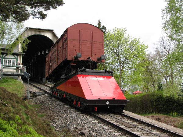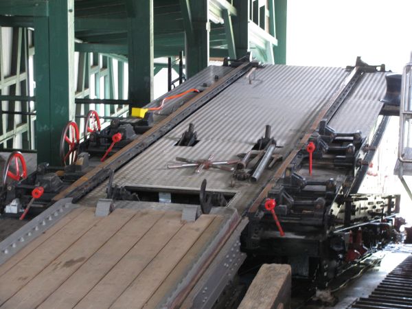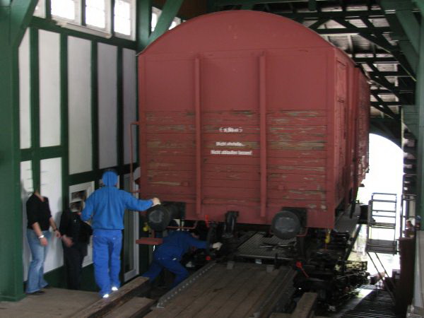 geschoben Insgesamt 4 Personen sind nötig, um den Wagen zur Drehscheibe zu schieben und auch dort wieder abzubremsen. Dann wird die Scheibe mittels eines Seilzuges gedreht, damit man den Wagen in Richtung des Flachstreckenbahnsteiges abstellen kann. |