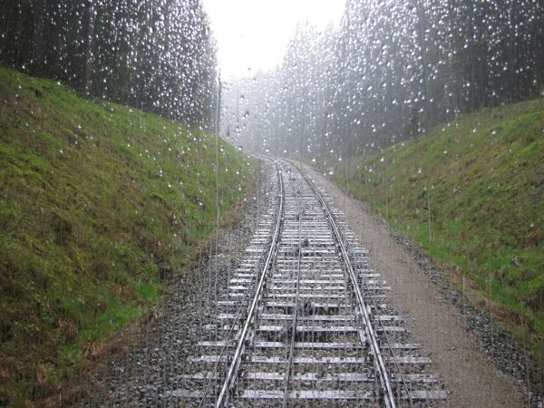 Die Talfahrt beginnt Kurz nach dem der Fotostandort erreicht ist, beginnt sowohl die Talfahrt des Güterwagens wie auch ein erneutes leichtes Nieseln, vom dem allerdings unter diesem Baum glücklicherweise nichts zu spüren ist. Trotzdem ging es nun wieder zügig in die Bergstation, denn mit dem nächsten eintreffenden Personenwagen sollte es ins Tal gehen. Das Bild vom Treffen mit dem wieder nach oben gezogenen Güterwagen ist weiter oben schon zu sehen gewesen und der interessierte Betrachter hat schon das inzwischen aufgezogene Wetter (mit Blitz und Donner) zur Kenntnis genommen. |