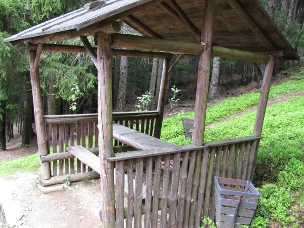 Warten auf die nächste Begegnung Dieser gemütliche Unterstand konnte mit großem Zeitpolster erreicht werden. Das Kabel bewegte sich nicht, und somit war klar, dass mindestens 7 bis 8 Minuten Zeit war, die Landschaft und die Stille zu genießen. Es war ein einmaliges Erlebnis, zumindest solange, bis zuerst von Ferne, dann näher kommend, einige Herren zu hören waren, die wohl schon mal für ihren Vatertagsausflug trainierten. Während ich die folgenden Fotos machte, waren sie inzwischen angekommen und "vernichteten" ihre mitgebrachten Vorräte. |