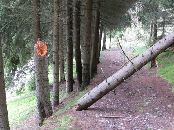 Nichts kann uns hindern Im Nachhinein betrachtet sieht der Waldweg auf den Fotos wenig spektakulär aus. Aber Steine, Wurzeln, Wasser und die Steilheit waren schon heftig. Da hätte es eines abgebrochenen Baumes nicht auch noch bedurft. Übrigens erläutert eines der Schilder auf dem Lehrpfad das es hier eine Steigung von einem Meter auf einen Weg von 4 Metern gibt. |